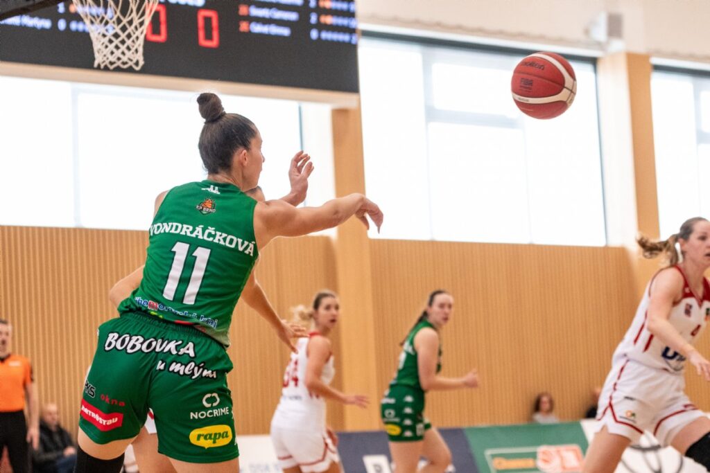Michaela Vondráčková z KP Brno pálí na koš v utkání proti Brandýsu