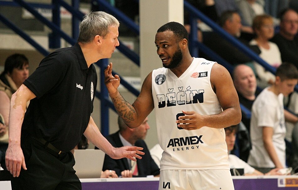 Nový rozehrávač Válečníků Posh Alexander v debatě s trenérem Tomášem Greplem