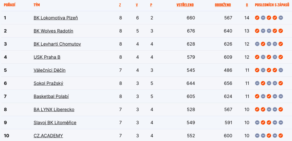 Ve skupina západ se hned osm týmů seřadilo v rozmezí jediné výhry mezi třetím a desátým místem. Na druhou pozici naopak poskočil Radotín, jenž přestřílel (i bez Dalibora Faita) dosavadní překvapení této sezony Chomutov 97-84. Už do půle zaznamenali Wolves při vynikající 65% úspěšnosti z pole 58 bodů a vedli o pohodových 21. Proti takovéto kanonádě Levharti neměli až na 25-bodového Čermáka odpověď, takže podlehli potřetí z posledních čtyřech utkání. Radotín tlačilo duo 20-bodových hráčů Novotný se Žejdlem a druhý jmenovaný “přihodil” navíc i 10 doskoků.